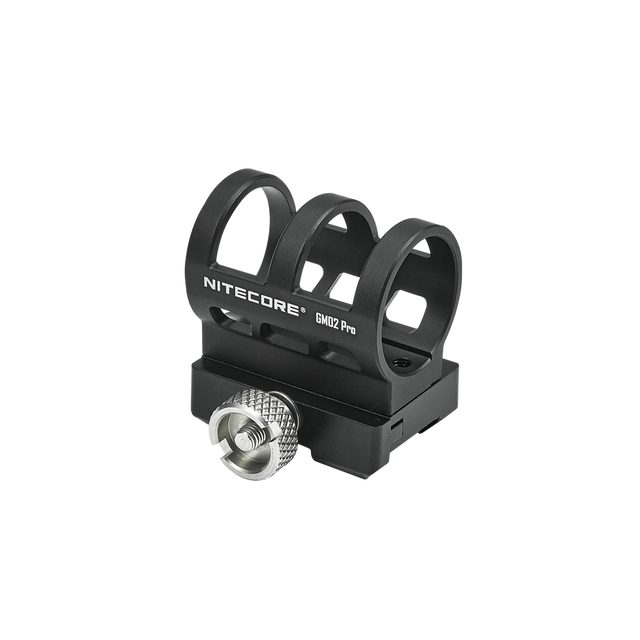 The Nitecore GM02 Pro is constructed from aero-grade aluminum alloy with HA III military-grade hard-anodized finish for durability. A large stainless steel thumb nut allows for easy adjustment and ensures stable mounting on a Picatinny rail. It can fit flashlights with a body diameter of 25.8 mm-26.5 mm and fits models like the Nitecore SRT7i, SRT6i, MH12 Pro, and MH25 Pro.