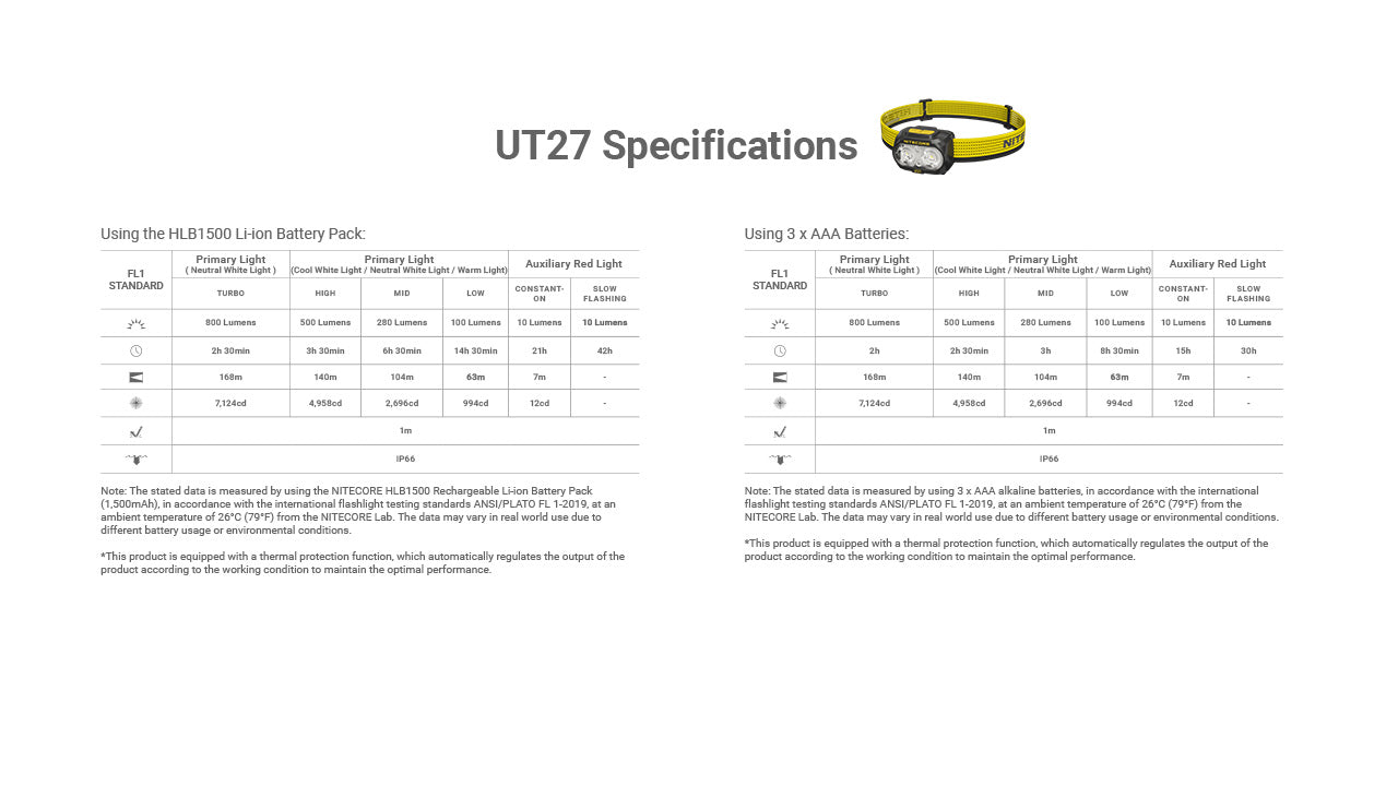 For power, the UT27 MCT includes a USB-C rechargeable HLB1500 battery pack and is also compatible with 3×AAA batteries for backup flexibility. A built-in power indicator shows charging status, while lockout mode prevents accidental activation. With ultra-low standby power, it stays ready year-round, and a glow-in-the-dark battery compartment makes replacements easy in the dark. Weighing just 2.61 ounces (with battery and headband), the UT27 MCT is an excellent running companion. The breathable headband features a silicone strip that keeps the lamp secure and channels sweat away from the eyes, while reflective decals boost nighttime visibility. Rugged and reliable, the UT27 MCT withstands 1-meter drops and carries an IP66 rating, protecting against heavy rain and splashes.